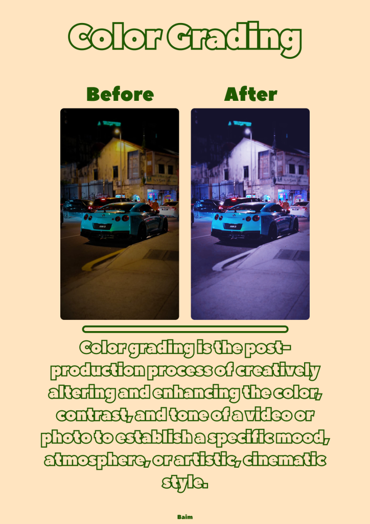 Below, it explains that color grading is a post-production process that alters and enhances the color, contrast, and tone of a photo or video to create a specific mood or a more engaging visual style. The poster also includes the creator’s name, Baim, as the design identity.