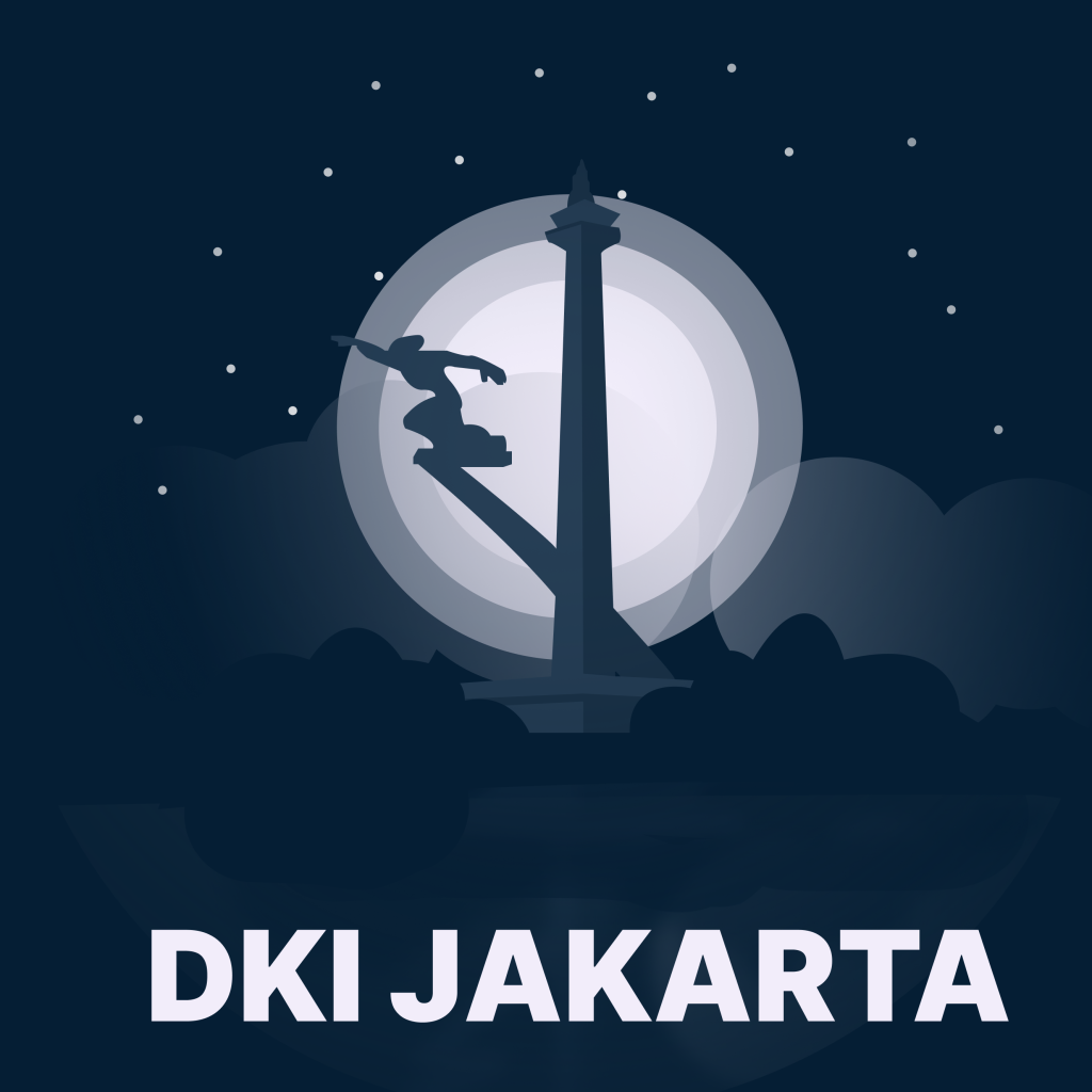 This image features a distinctive illustration that embodies Jakarta’s identity as the capital of Indonesia. The central icon is the National Monument (Monas), a towering historic monument that symbolizes the nation’s struggle. Behind Monas, a large, bright full moon appears to illuminate the entire city at night, creating a majestic yet serene atmosphere.