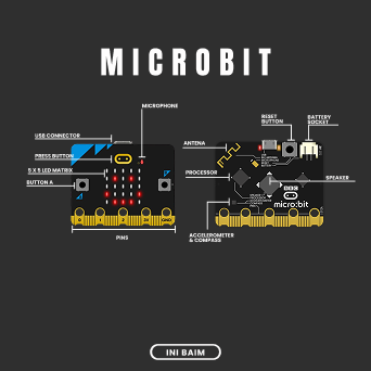 Bagian bawah gambar diberi label “INI BAIM”, menunjukkan identitas pembuat infografis. Secara keseluruhan, desain ini bertujuan memberikan pemahaman singkat namun jelas tentang bagian-bagian penting Micro:bit, menjadikannya sebagai materi edukasi visual yang ringkas dan informatif.