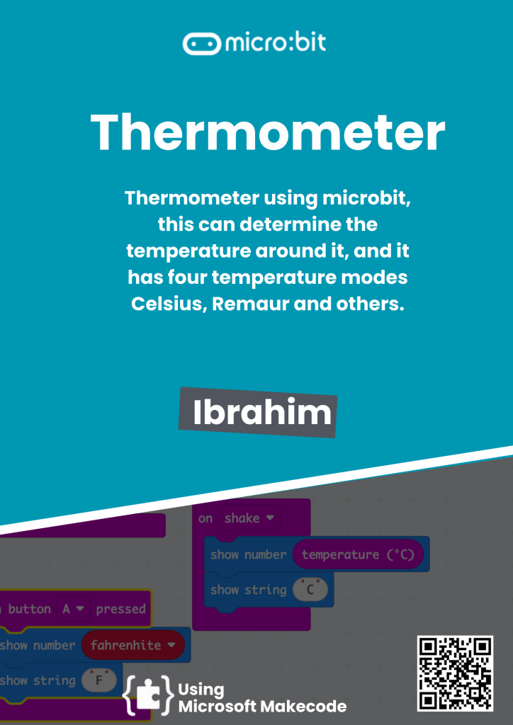 Thermometer using microbit, this can determine the temperature around it, and it has four temperature modes Celsius, Remaur and others this project using block code to program and using math to convert different temperature unit.