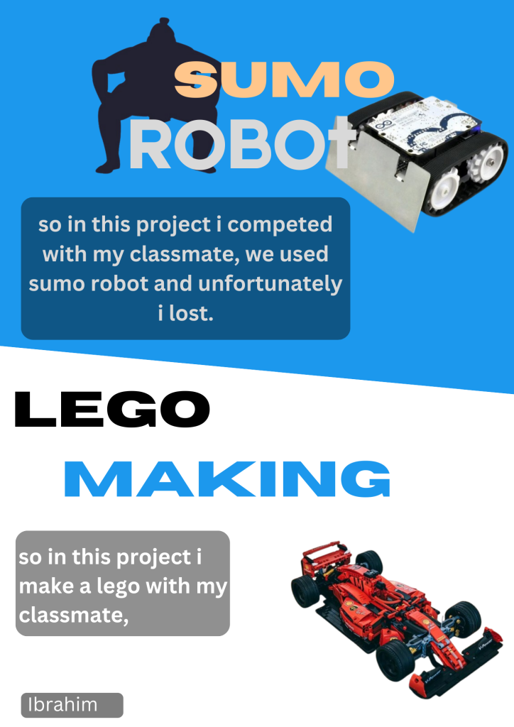 In this project, I made a lego with my classmate and also sumo competition but in sumo competition and im lose ok no problem